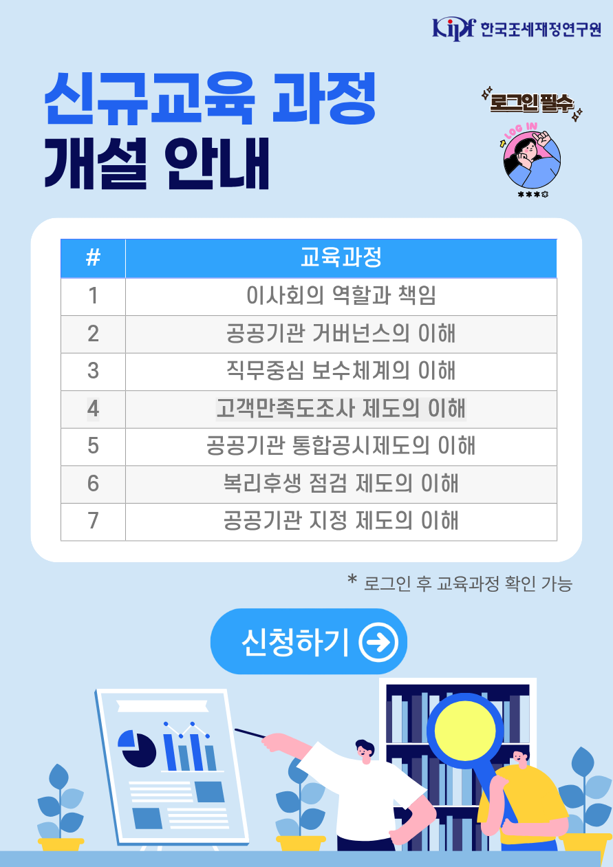 □ 한국조세재정연구원 공공기관연구센터에서는 공공기관의 역량제고를 위해 ‘공공기관 교육포털’을 운영하고 있습니다.