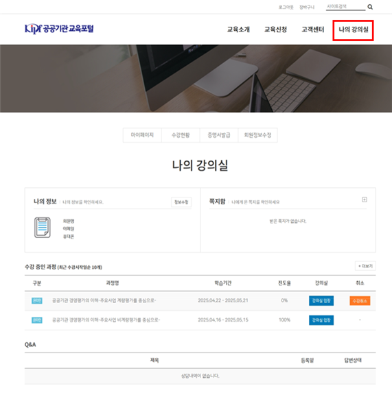 □ 나의 강의실 - 마이페이지에서 교육 신청 확인 및 취소 가능 - 교육 후 설문조사 작성 완료 후 수료증 출력 가능